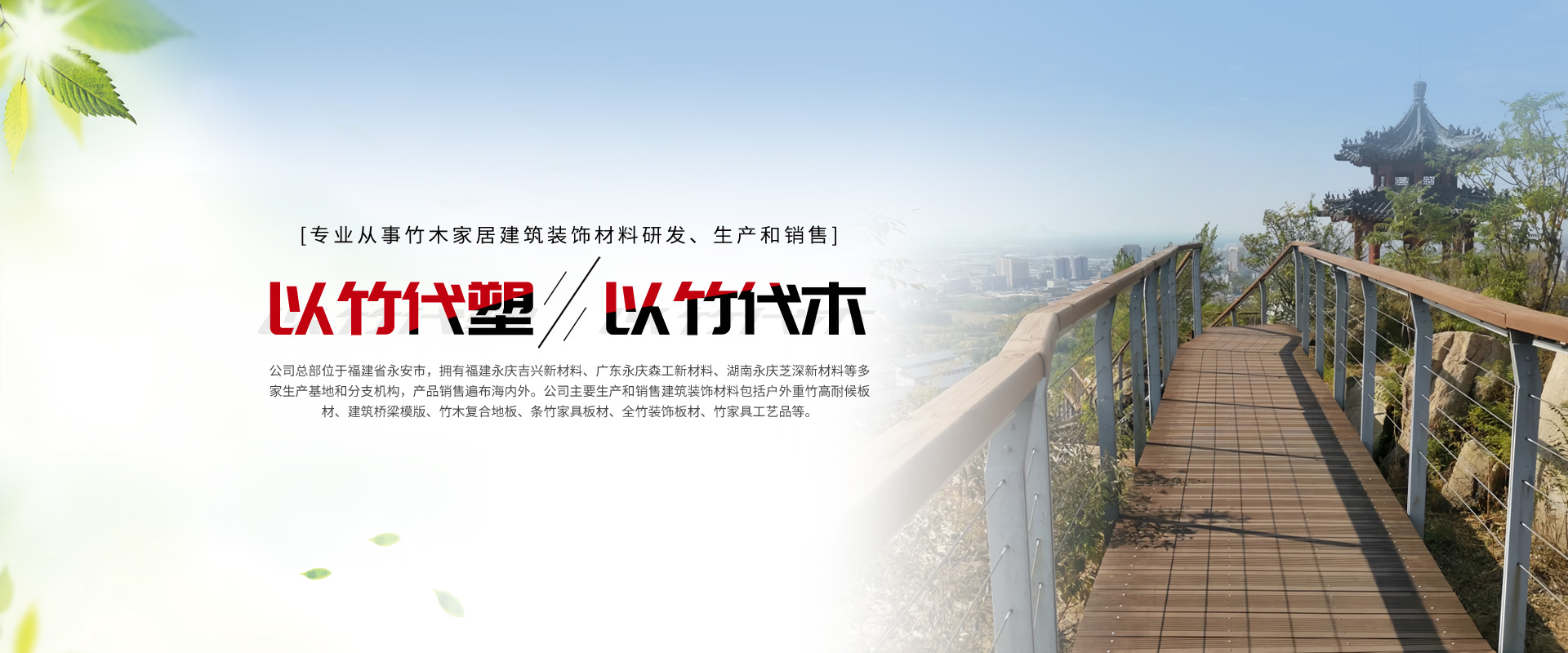 廈門永慶家居建材有限公司是福建永慶新材科技集團公司旗下一家專業從事竹木家居建筑裝飾材料研發、生產和銷售的企業。公司總部位于福建省永安市,擁有福建永慶吉興新材料、廣東永慶森工新材料、湖南永慶芝深新材料等多家生產基地和分支機構,產品銷售遍布海內外。公司主要生產和銷售建筑裝飾材料包括戶外重竹高耐候板材、建筑橋梁模版、竹木復合地板、條竹家具板材、全竹裝飾板材、竹家具工藝品等。公司注重產品品質和創新,引進世界先進的生產設備和技術,不斷推出高品質、高性能、環保、節能的新型竹木建筑裝飾材料,獲得了廣泛的市場認可和用戶信賴。